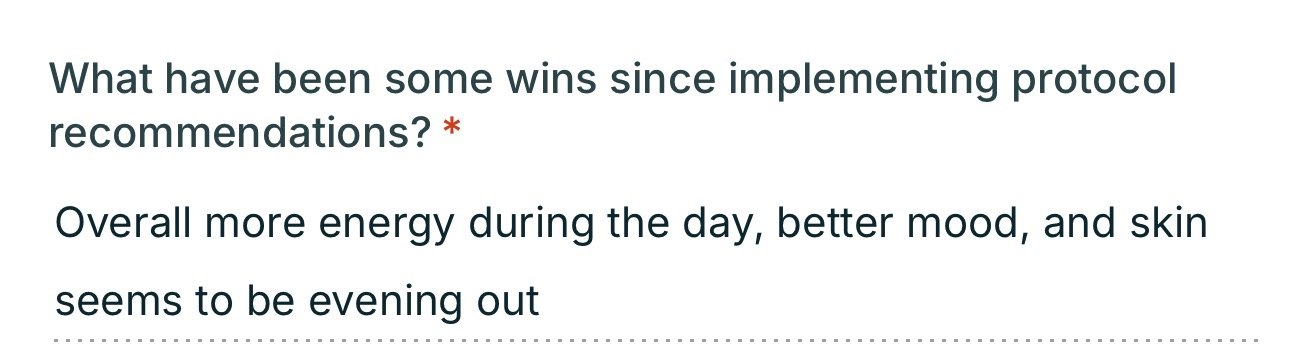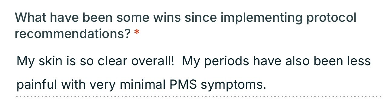 It’s not a surprise nowadays that gut inflammation drives systemic inflammation. Aka if you have acne, your gut is involved in some way or another. Almost all clients I work with have some level of dysbiosis and/or candida, h pylori, and parasites. Ultimately, it’s not your hormones that are causing the problem…it’s what’s causing them to be “off” in the first place - aka commonly your gut and liver - which is where I like to start working with clients first! I absolutely value the importance of testing hormones and love taking a deeper look AFTER we clean up all factors that could be impeding their optimal levels. The DUTCH Complete panel is something that we can add on for an additional investment. In some cases, we can pull the trigger on it right away too! In addition, I don’t want to further waste your time by throwing things at the wall and guessing to see if something sticks. Let’s identify what your body is needing through testing to confirm.